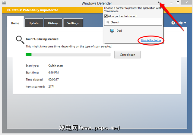 也许您想做一个演示文稿,或者在特定程序中仅需要帮助。如果您不想炫耀您的整个计算机,可以在TeamViewer运行时单击任何窗口右上角的双箭头,然后选择要与之共享窗口的联系人。