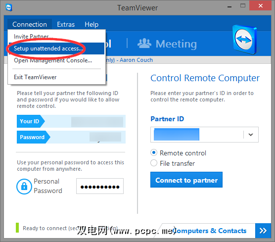 为此,请转到帐户右上角的“连接"。在TeamViewer窗口中,然后单击“设置无人值守访问"。按照指示输入计算机名称和密码,您就可以完成!