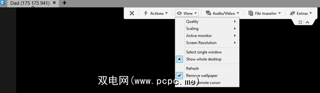 可以修改各种视觉设置,以带给您实际使用远程连接计算机的感觉,或者优化速度和速度。降低分辨率以降低连接速度。您可以通过转到TeamViewer工具栏中的“查看"(连接时)来执行此操作。系统会为您提供几个选项:“质量",“缩放比例",“屏幕分辨率"以及“显示整个桌面",“删除壁纸"等。另外请注意“其他"菜单下面的“全屏"按钮。