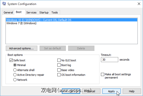 要在在Windows 10中,在搜索栏中输入 msconfig 并打开系统配置。转到启动标签,然后选中标记为安全启动的复选框,并将单选开关设置为最小。然后尝试从安全模式运行系统还原。