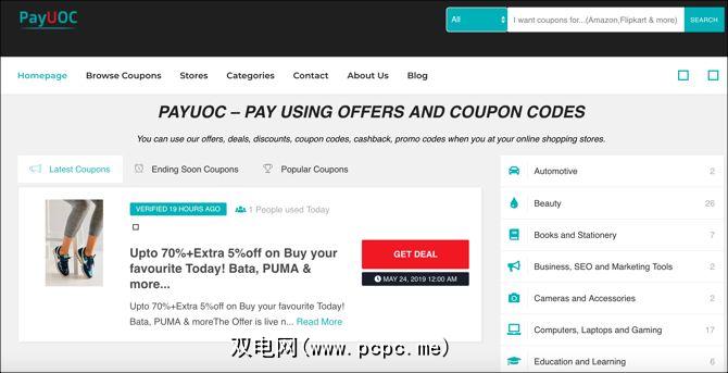 PayUOC表示使用优惠和优惠券代码付款。如果您有特定的商品,此在线折扣商店可让您搜索优惠券。弹出关键字,选择类别或商店,然后搜索在线代码或在线销售。