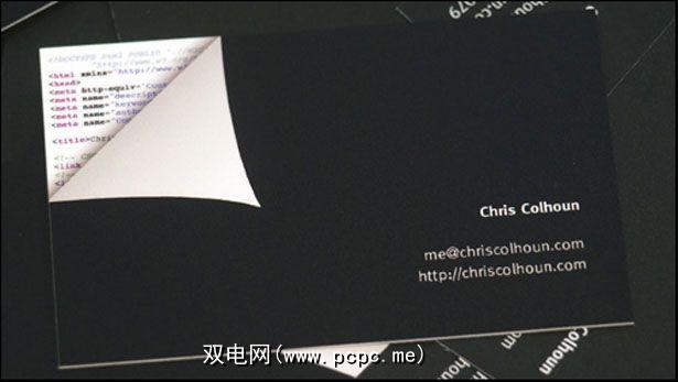 Chris Colhoun是一名网页设计师,因此他的名片可以使您窥视该名片的“源代码"。我不确定襟翼是否只是卡片上的图示,或者您是否可以自己将其揭开,但这两种方法都很棒。