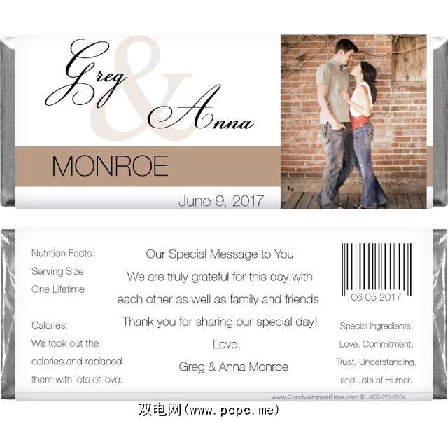 Candywrapperstore将创建自定义巧克力包装纸,您可以将其发送给客人。充分利用这项服务,包括重要日的细节以及一些小窍门和古雅的短语,以期让您的宾客流连忘返。