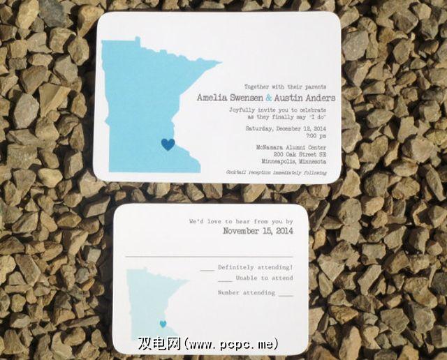 如果您为自己的家乡而自豪,那么可以与每个州举行婚礼,与所有人分享自己的骄傲邀请。有很多选择,但是这些来自StelieDesigns的明尼苏达州婚礼邀请显示了如何完美实现这一目标。