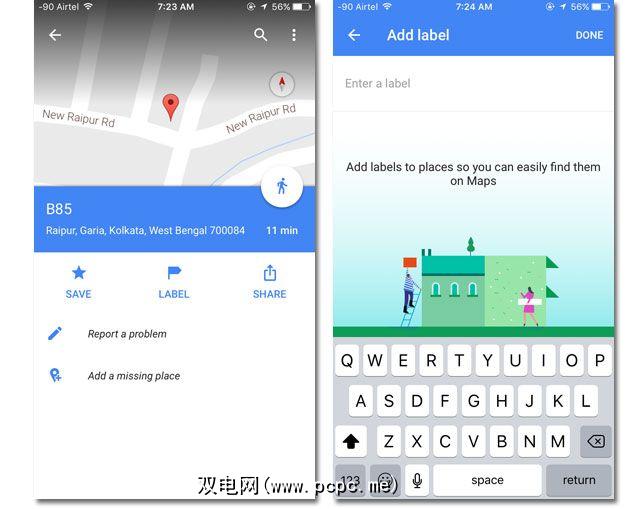 在Google Maps应用中,搜索地址。或通过点击并按住在地图上的确切位置放置图钉。点击屏幕底部的地点名称,后跟标签以输入自定义昵称。