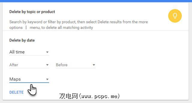 您可以从iOS上的Google Maps历史记录设置中删除单个搜索到的项目。但是要删除您所有的Google Maps历史记录,您必须在计算机上登录Google Maps。转到菜单>历史记录>删除活动依据>按主题或产品删除。