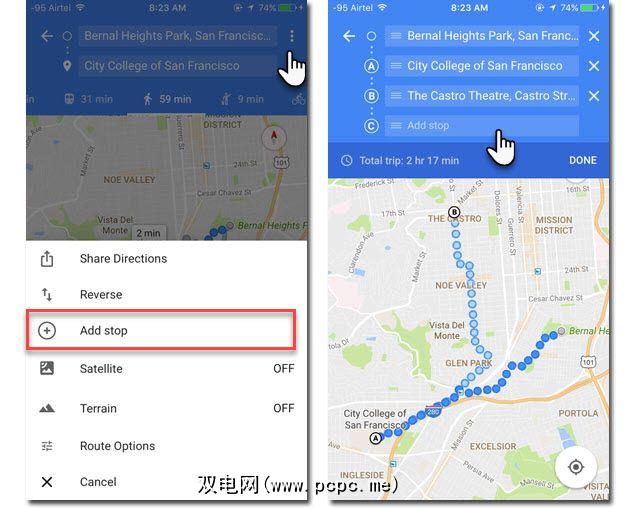 在Google地图中,点击蓝色图标打开路线,然后添加起点和目的地。在右侧,点击三个点以弹出菜单,然后点击添加站点。