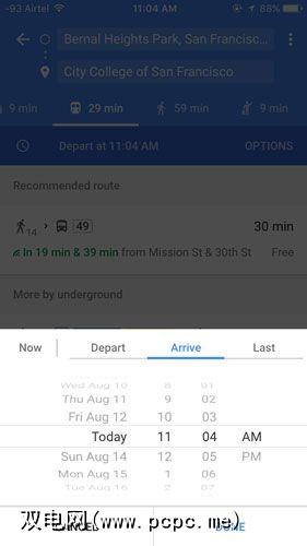 现在,点击公共交通图标。再次点击出发时间时间指示器。您可以更改出发时间和到达时间时间,以提前计划行程。点击完成。
