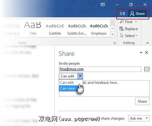 注意功能区最右侧的共享标签。系统将提示您保存到云。您可以将其保存在OneDrive共享文件夹或SharePoint位置。邀请其他人并授予他们访问权限,以查看文件或进行编辑。团队成员还可以在免费的Office Online中打开文档-他们不需要桌面Microsoft Office套件。