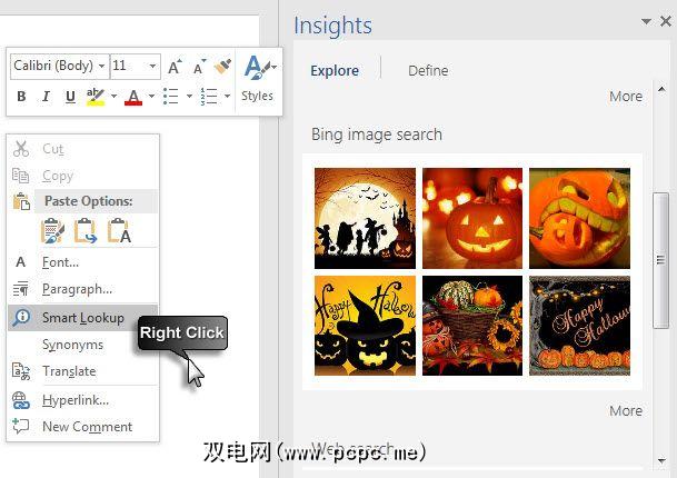 突出显示一个术语并在Microsoft Office中使用由Bing支持的智能查找2016年(Insights)从Web引入搜索结果。在应用程序的右侧会打开一个侧边栏,其中包含来自各种网站(如Wikipedia)的搜索结果。您可以将信息拖放到创作环境中。