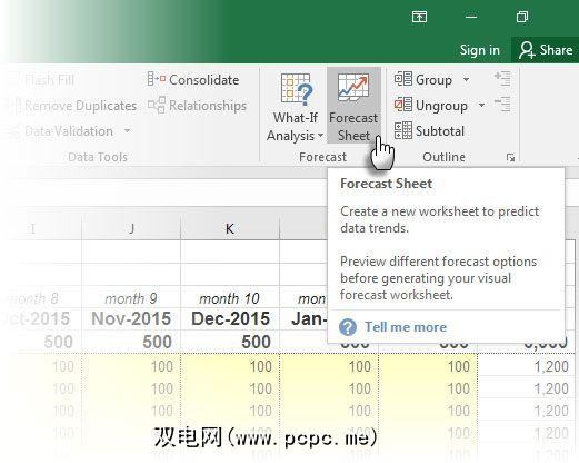 从早期版本中的线性预测中,Microsoft Excel 2016会为您提供一键式按钮数据序列的指数预测。转到丝带>数据>预测表。