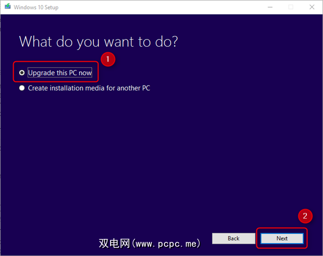 就地升级需要Windows 10安装文件,您可以使用Windows 10 Media Creation Tool(也将在下面提到)获取Windows 10安装文件。该过程不是很复杂,甚至不需要安装。首先,请考虑在发生灾难性事件时备份Windows。其次,下载Windows 10 Media Creation Tool。第三,运行程序。运行该软件后,您需要点击一些菜单。最终,选择选项立即升级此PC ,然后单击下一步。
