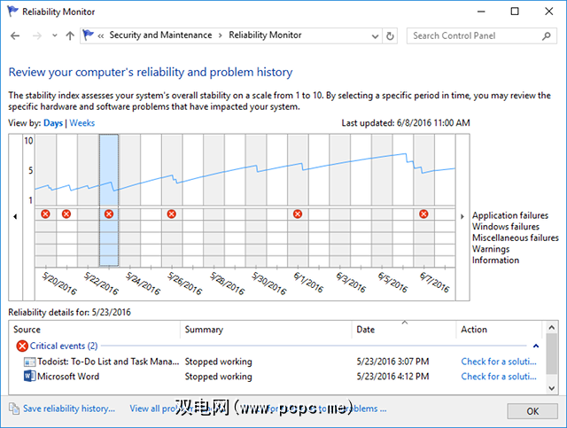 可靠性监视器是一个隐藏的工具,一直存在自Windows Vista以来,还有很多人从未听说过它。它位于控制面板中的系统和安全性>安全性和维护>维护>查看可靠性历史记录。