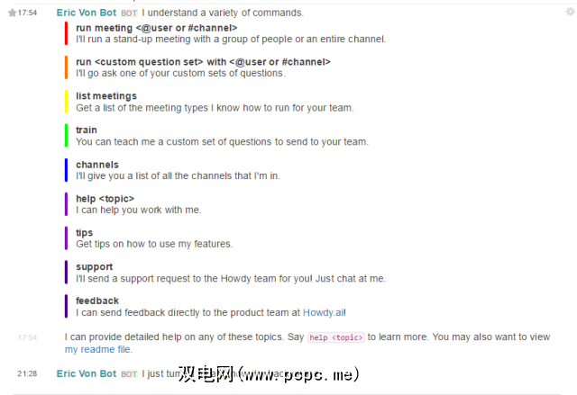 Howdy是另一个可以帮助您运行会议以及团队管理的机器人。例如,您可以向Howdy定期提出一系列问题,例如“您在做什么?",“何时完成?"和“谁在以下方面写了关于我的粗鲁评论"?
