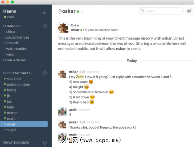 每天早晨(或每当您登录Slack进行咨询时,第一次-我本人是午餐时间),奥斯卡(Oskar)会根据1到5之间的评分来询问您的情况。如果您说自己还好,他会打五分。如果您说自己感到不高兴,他会通知您团队的其他成员,以便他们都可以在Slack 到叫你一个可悲的git 来振作起来。您会从其他团队成员那里获得状态更新,而不必考虑忽略他,因为他会一直询问。他的沉默不能胡说八道。