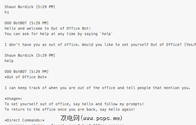 Out of Office是一款具有一个功能的简单bot。当有人在Slack上向您致敬,而您不在时,系统会向该人显示您预设的外出消息。就像电子邮件版本一样。您可以使用它为同事提供您的当前联系电话号码,当前位置,何时回来等。