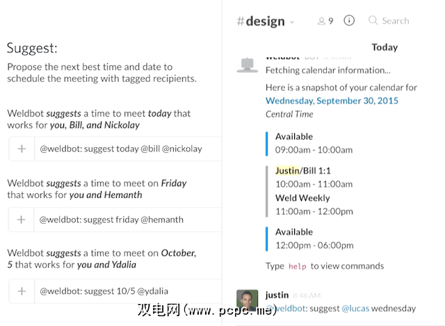 Weldbot看起来就像是另一个会议组织者和计划者,但是有一个区别。它仅适用于手机。因此,您可以在移动Slack应用程序上启动Weldbot,然后当有人问您有空会议时,Weldbot会检查您的日历t0,看看您是否有空间。然后,它会列出可能的会议时间供您选择。
