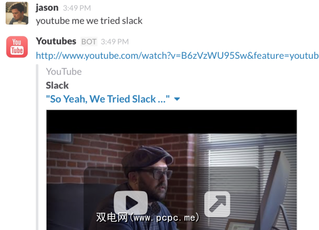 同样简单,一旦您指定了搜索词,YouTube bot就会嵌入YouTube视频。它将为您提供它找到的第一个结果并将其嵌入到Slack频道中。显然,视频需要在YouTube上激活嵌入功能,嵌入部分才能正常工作。视频将显示为“在线",您可以在那里直接播放视频。简单