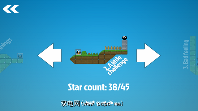 80个级别分为不同的难度类别。每个新类别都会引入尝试杀死您的新机制-从尖峰到激光枪再到熔岩。您拥有无限的生命,但是游戏如此优雅地记录了您在一个级别上进行的尝试次数以及每个类别中死亡的次数。