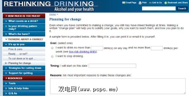 该网站还提供了“变革计划"功能,可让您列出您的特定目标,然后打印或通过电子邮件发送给自己,这样您就可以在离开网站后保持动力。您也可以下载并打印“ Drink Tracker卡",即使您没有在线设备,也可以在任何地方管理饮酒。