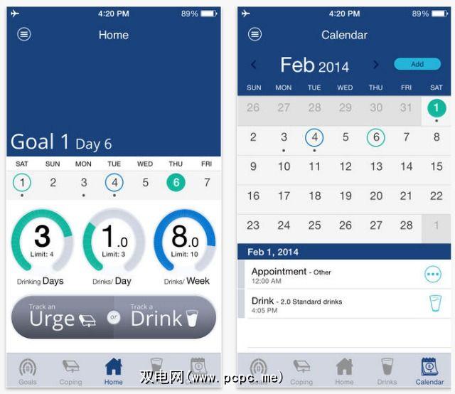 该应用程序干净,用户友好的界面包含有用的功能,例如催促追踪功能和应对技巧手册。在完成快速自我评估并创建个性化目标后,提醒用户不要喝酒,可以查看目标进度并跟踪饮酒情况。