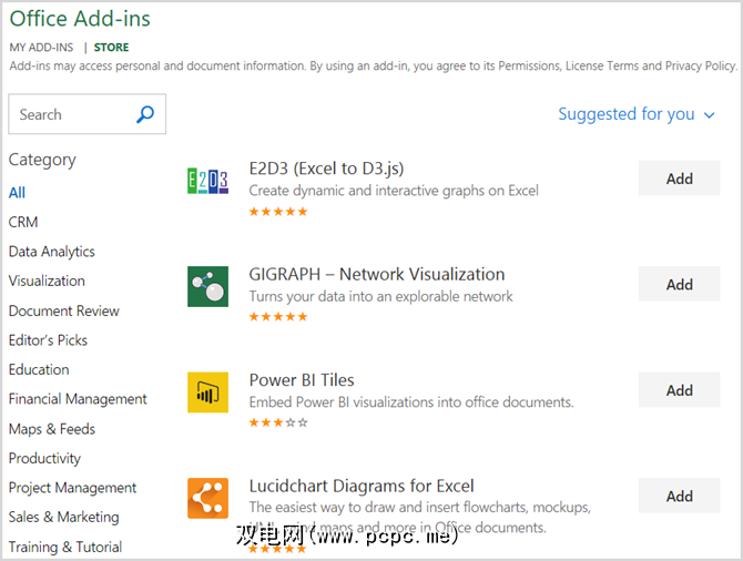 Microsoft Excel 2016拥有一个方便的存储,可以在Windows和Mac上访问。在打开Excel工作簿的情况下,选择插入标签,然后点击存储。 Office加载项存储打开后,您可以按类别浏览或搜索某个加载项。您也可以在线访问Office Store,然后从顶部导航中选择加载项。