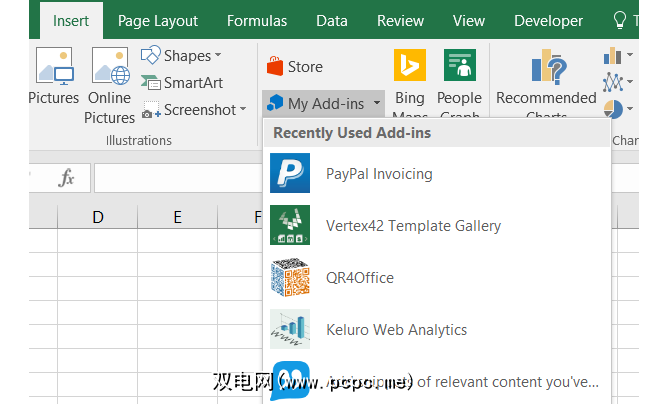准备使用新的加载项,请从插入菜单中选择我的加载项按钮。这将打开一个窗口,其中显示了已安装的加载项,双击将打开它。您也可以单击按钮上的箭头查看最近使用的箭头,然后选择一个。