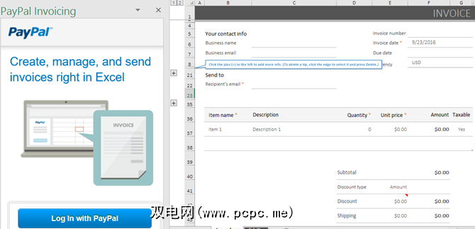 如果您的企业使用PayPal开票,那么此Excel插件是必不可少的。登录您的PayPal帐户后,发票已准备就绪,您可以轻松添加数据。弹出您的业务详细信息,发票和到期日,以及您的商品,说明和价格。