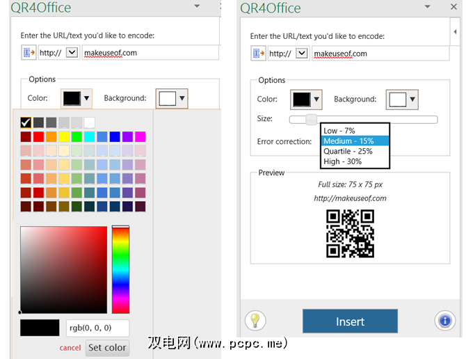 为在电子表格中添加漂亮的QR码,QR4Office是一个很棒的工具。您只需添加要编码的URL或文本,然后为前景和背景选择颜色。您还可以调整大小并查看代码的漂亮预览。