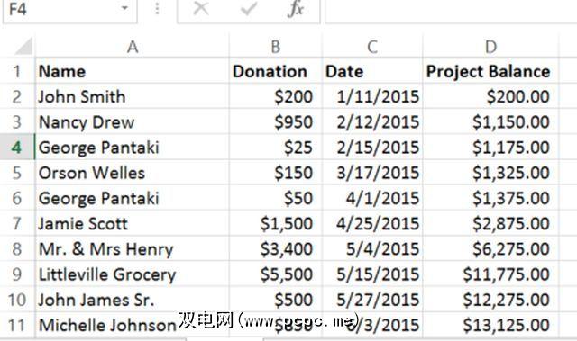 无论列表是什么,Excel都可以帮助您快速组织和排序值。让我们以PTC为例。这是社区成员的捐款列表。
