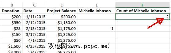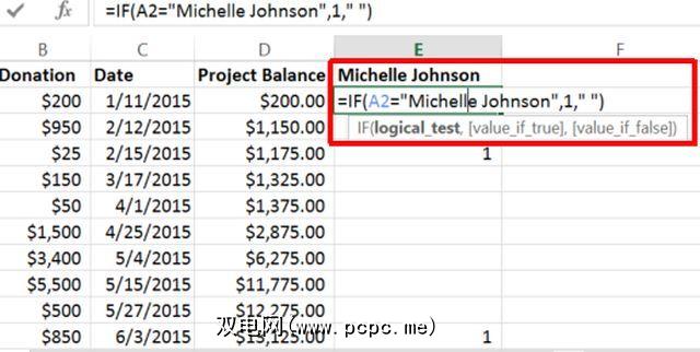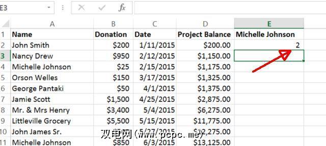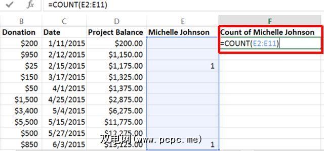 此公式将查看A列,其中包含所有供体名称,并且如果范围内的单元格与引号中的条件匹配,则按一。这样一来,您就可以一次计算出捐赠者姓名等于“ Michelle Johnson"的所有时间。