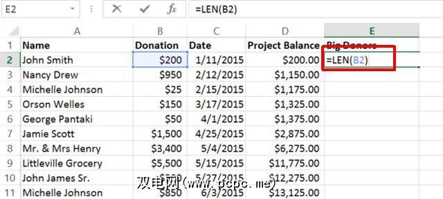在上面的示例中使用此字符的一种有趣方式是通过计算捐赠列中的位数来突出显示捐赠超过1,000美元的捐赠者