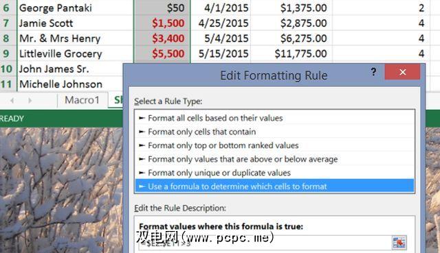 在此示例中,如果您将条件设置为“> 3",则超过$ 1,000的任何内容都会收到特殊格式。不要忘记单击 Format…(格式...)按钮,并选择所需的特殊格式。