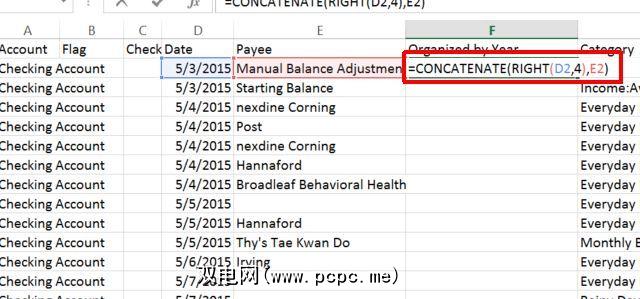 上面的函数告诉Excel将D列中的文本作为文本,并从右侧提取四个字符。 CONCATENATE 函数将这四位数字与下一行的收款人文本拼在一起。