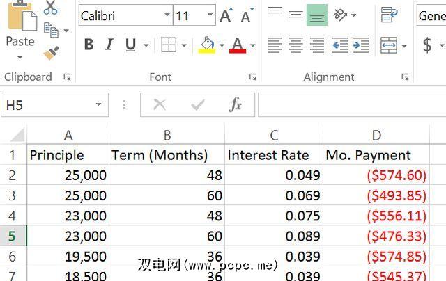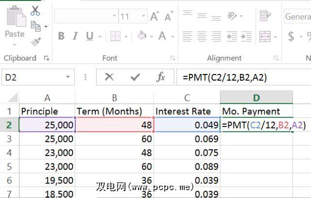 这是一种很酷的方法快速比较各种贷款以了解您的付款情况;只需创建一个Excel工作表,其中列出了每笔潜在的贷款以及有关它们的所有可用信息。然后,创建“付款"列,并使用PMT公式。