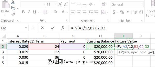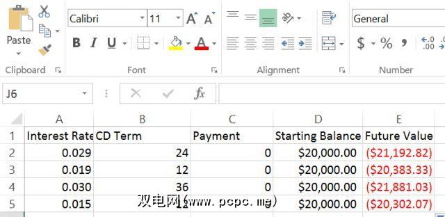 如您所见,利率再次以十进制格式表示(以银行给您的利率除以乘以100),且付款为零,因为CD的付款通常基于已支付的起始值和终值。这是当您对要考虑的每张CD使用FV公式时的比较结果。
