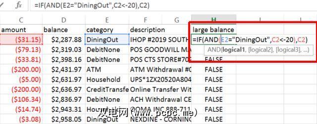 在一个公式中同时使用IF和AND看起来很棘手,但是如果您考虑一下,这是很合理的。如果AND语句为true,则IF语句将输出美元金额(C2),否则为FALSE; AND语句将检查类别是否为“ DiningOut",并且交易金额是否大于20美元。