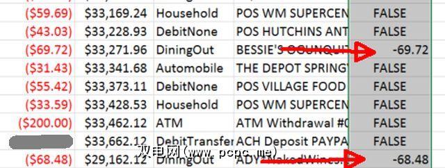 要执行此操作,只需在新列中创建逻辑函数,查找类别列为“ DiningOut"且交易列大于-$ 20的任何值(下面的比较显示为“ <",