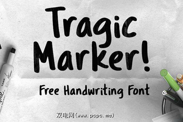 Tragic Marker是一个很好的选择,如果您正在寻找看起来像是使用标记写的手写字体。该字体可用于个人或商业用途。在Photoshop上使用笔刷之类的标记,您也可以使用本文前面列出的教程在文本中添加该标记感。
