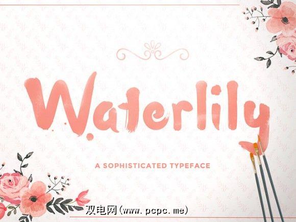 Waterlily是另一种有吸引力的免费画笔字体,效果很好,与上面链接的教程有关如何使您的字体看起来像是用Photoshop水彩画的教程一样。包含所有字形的字体可用于个人或商业用途。