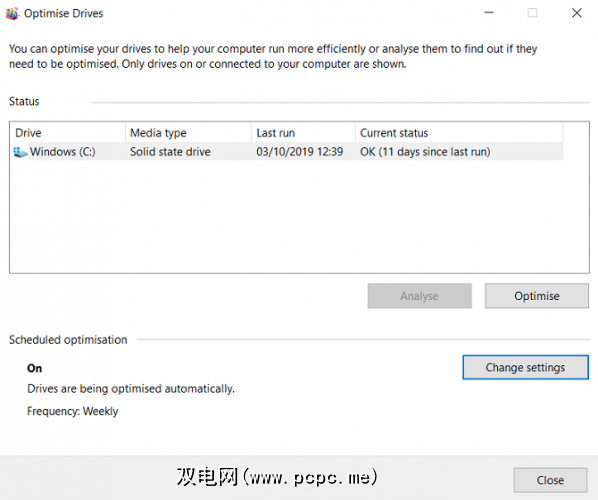 突出显示要修复的驱动器,然后单击分析或优化,具体取决于您要执行的功能。要确保正确设置计划,请单击更改设置,然后勾选按计划运行旁边的框。
