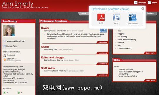 结果,您会获得免费的在线Linkedin个人资料简历,您可以将其链接到或下载以发送给潜在员工: