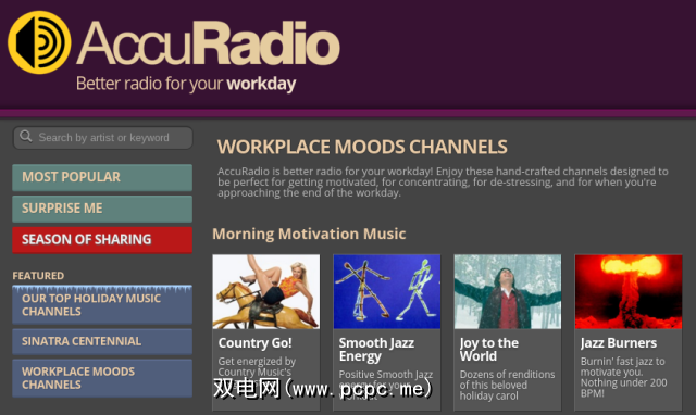 AccuRadio [不再可用] -世界上几乎每个在线广播电台都触手可及。这样做的好处是,他们为您创建了电台的收藏,例如圣诞节音乐,职场情绪音乐,类型和更多精选收藏。