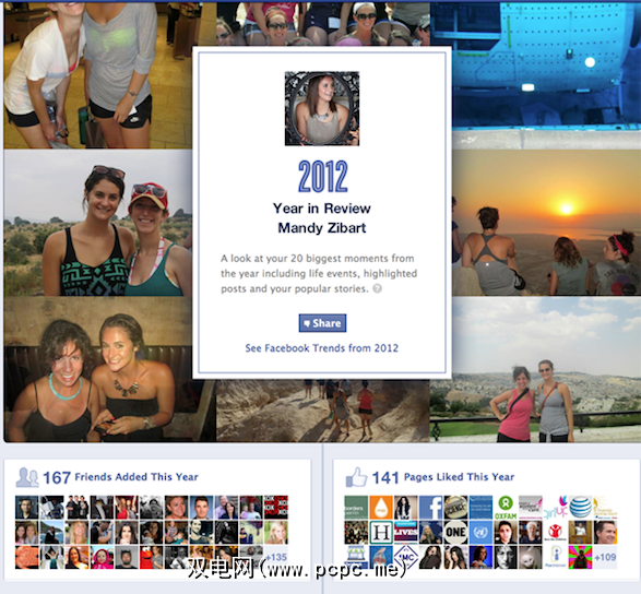 Facebook不仅分享了自己当年的亮点,还为用户提供了一种查看自己当年回顾的简便方法。只需访问Facebook.com/yearinreview,您应该能够看到2012年添加了多少朋友,喜欢的页面数以及显示该年度的前20个时刻。不过,我们不确定Facebook如何确定前20名。