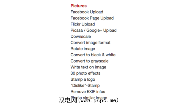 任何上传到指定Dropbox文件夹的图像都可以调整为您选择的尺寸,然后上传直接到Facebook,Flickr或Google云端硬盘。您甚至可以通过多种方式操作图像(请参阅下面的完整列表)。您可以添加水印(印记/徽标),转换为黑白,在图像上写文本,转换文件类型以及旋转图像。