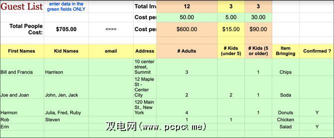 跟踪谁参加了您的聚会,他们承诺带来什么以及他们是否参加了聚会确认他们将参加。电子表格还可以自动计算出每个与会者的费用(如果有)。请记住,仅编辑绿色单元格,尽管如果需要可以轻松添加任何其他列(如“饮食要求")。