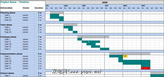 使用此简单的甘特图组织项目时间表。将任务划分为不同的阶段,并每周执行一次,因此,一目了然地了解复杂项目的总体结构是一种野餐。
