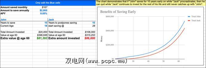 此计算器可让您快速查看不同情况下的节省预算,目的是向您展示如果谨慎保存,这将如何导致提前退休。只需更改周围的蓝色数字并在图形上查看效果即可。