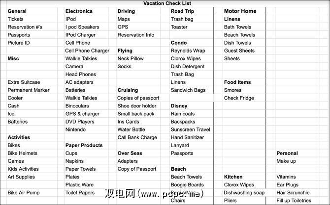 去度假应该是一种放松的经历。使用并编辑此Google Docs清单模板,以使您的装箱轻松无忧,仅在您意识到自己忘记了手机充电器的情况下,才能阻止自己到达酒店。