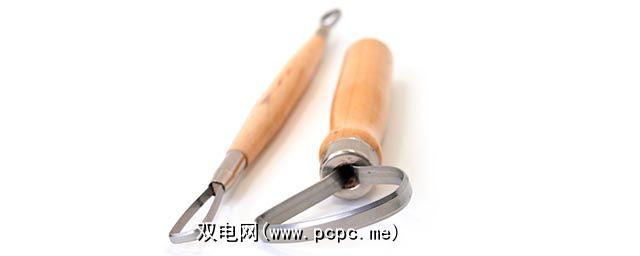 粘土色带工具非常方便。当您需要刮除大部分南瓜皮时,较大的刀片会有所帮助,而较小的刀片则非常适合复杂的细节。但是,南瓜比粘土坚硬,因此,请跳过细线工具,转而使用头部较粗,更扁的工具。
